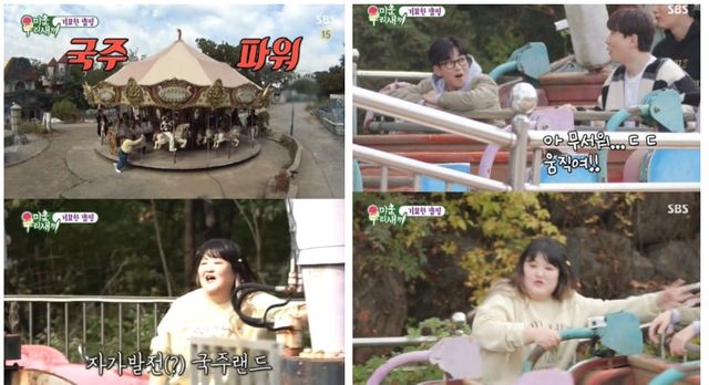음식이 준비되는 사이 기념 사진을 찍기로 한 여섯 사람은 회전목마 위에 앉았습니다. 그러나 그 때 폐장된 놀이공원임에도 회전목마가 움직이자 모두들 소스라치게 놀랐습니다. 알고보니 이국주가 온 힘을 다해 회전목마를 밀고 있었던 것. 이국주는 후진도 자유자재로 했고 김종민과 남창희는 이국주의 힘에 경악을 금치 못했습니다. 속도를 높여달라는 김종민과 딘딘의 요구에 이국주는 "세게 돌려주고 싶은데 이게 잘 안되네"라며 힘들어 했습니다. 이 때 최진혁이 이국주를 도와주며 설레는 장면을 연출했습니다. 임원희, 김종민, 남창희, 딘딘은 이국주와 최진혁의 오붓한 시간을 위해 함께 힘을 모아 회전목마를 밀었습니다. 최진혁은 이국주의 "개그우먼을 만나본 적이 있냐"는 질문에 "한 번도 없다. 지금 연예인을 보는 것 같다"고 대답했습니다. 이에 이국주는 "미우새 보면서 캐릭터가 되게 셀 줄 알았는데 전혀 아니시다"라고 첫인상을 고백했고 최진혁은 "평소 이미지가 그렇습니다. 사람들이 허당이라고 하더라"며 서로에 대해 알아가는 시간을 가졌습니다. 그러나 생각보다 길어지는 대화에 회전목마를 밀던 네 사람은 기진맥진하는 모습을 보여 폭소를 유발했습니다.
