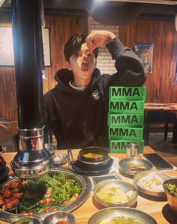 사진 속에는 한 식당에서 포착된 임영웅의 모습이 담겼다. 'MMA 2022' 행사를 마치고 늦은 식사에 나선 것으로 보인다. 테이블에 쌓아둔 'MMA 2022' 트로피들과 그의 장난기 넘치는 표정이 눈길을 모은다.